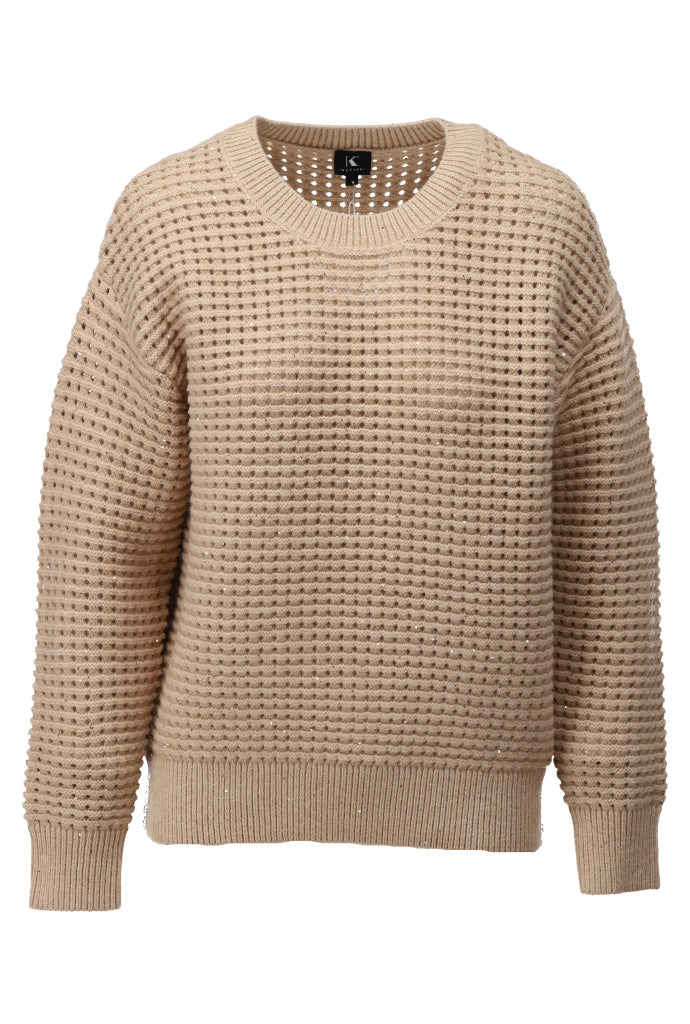 Afbeelding: K.design Pull ronde hals met lovertjes in Sand toont de zachte textuur en het verfijnde detail van de lovertjes (tekstuur en knipoog naar een subtiele sparkle).