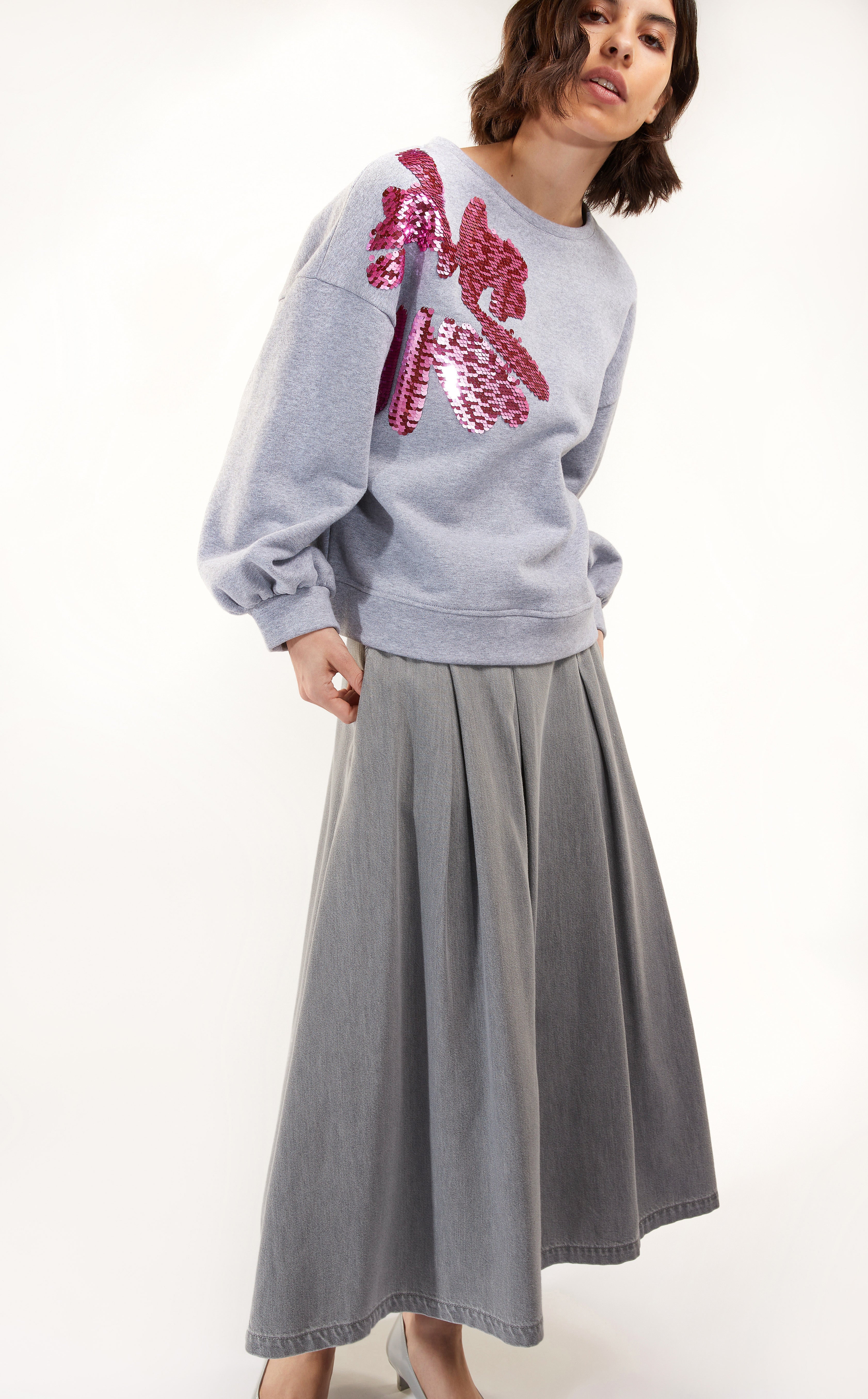 Meet the Pull s1962pl/r grey from Senso, a contemporary sweatshirt that effortlessly combines comfort and style. The grey melange creates a timeless base, while a striking pink sequin flower adds a playful touch. The images show different angles of the same garment, giving you a clear idea of the fit and details.