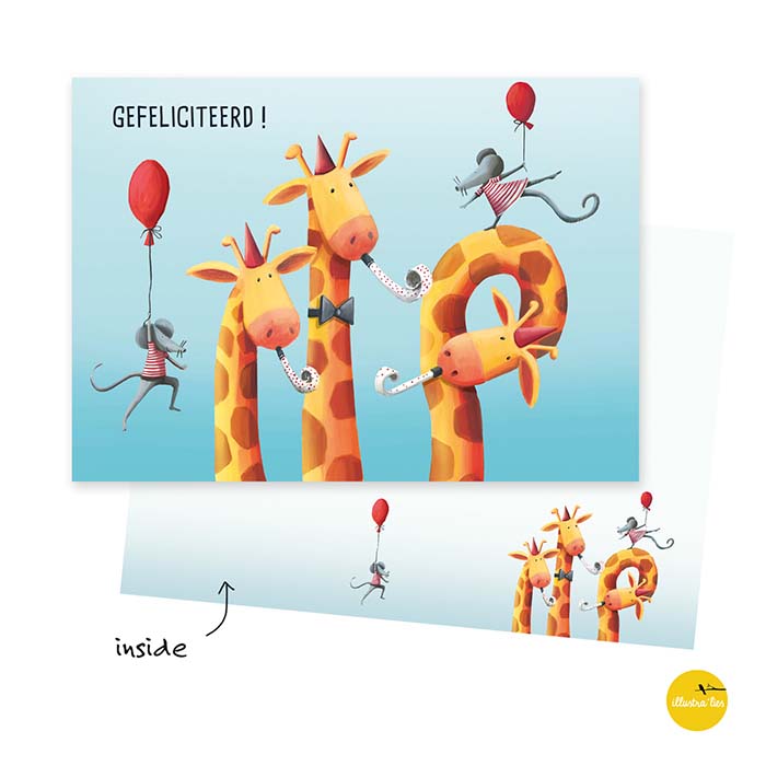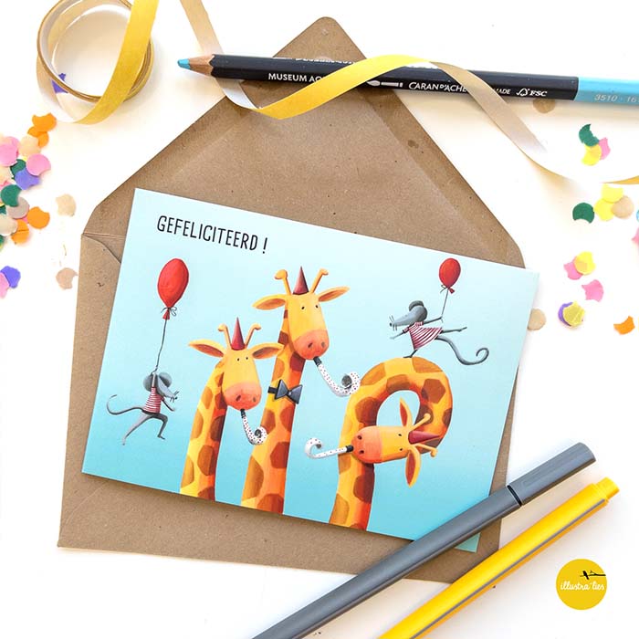 Accueillez la joie avec la carte de vœux - Girafe - Félicitations ! de la marque belge Illustra'lies. Cette carte joyeuse est parfaite pour envoyer vos meilleurs vœux lors d'occasions spéciales. L'illustration colorée de girafes superposées et de souris heureuses fera sourire tout le monde.
