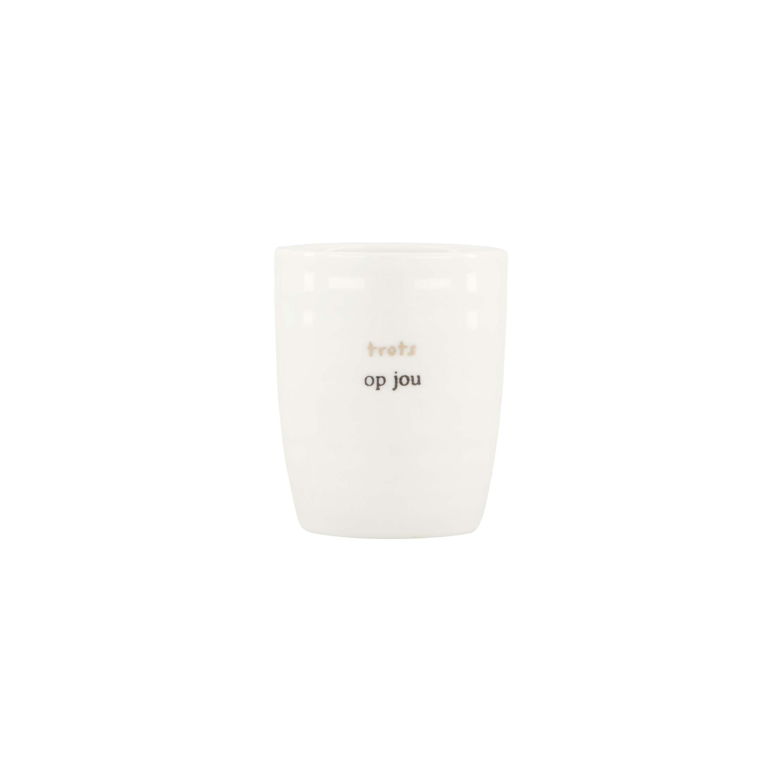 Met de opdruk 'trots op jou' maak je elk koffiemoment bijzonder. Geef jezelf of een dierbare dit unieke cadeau en laat elke slok een beetje extra stralen. Voeg de Espressokop 'trots op jou' vandaag nog toe aan je collectie en geniet van elke slok met een glimlach!