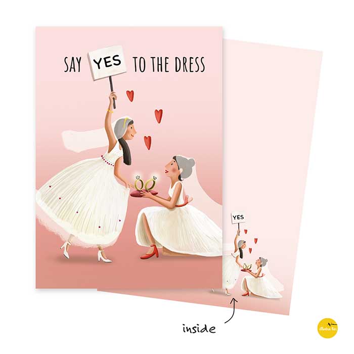 Breng een glimlach op het gezicht van een speciaal paar met onze Wenskaart - Huwelijk 2 vrouwen - Say YES to the dress. Deze prachtige kaart van het Belgische merk Illustra'lies is perfect voor het vieren van de liefde en het huwelijk van twee vrouwen. Het kleurrijke en speelse ontwerp toont een emotioneel moment vol vreugde, waardoor het een unieke en betekenisvolle manier is om je geluk te delen.